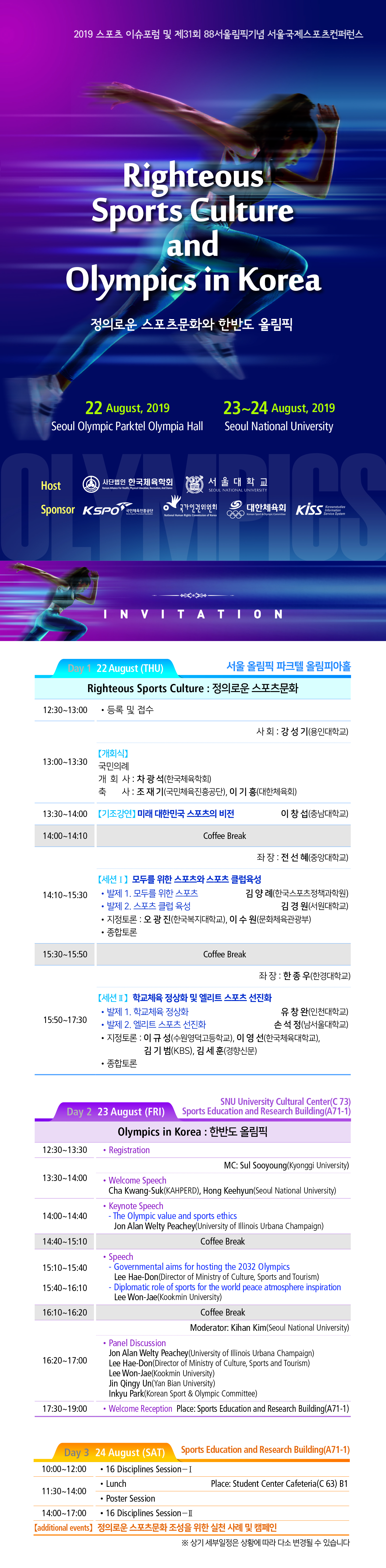 [2019 체육인 결의대회 및 제31회 88서울올림픽기념 서울국제스포츠컨퍼런스] 개최와 관하여 행사명이 아래와 같이 변경되었음을 안내드립니다. 또한 첨부된 안내포스터를 통하여 일정을 참고하여 주시길 바랍니다.